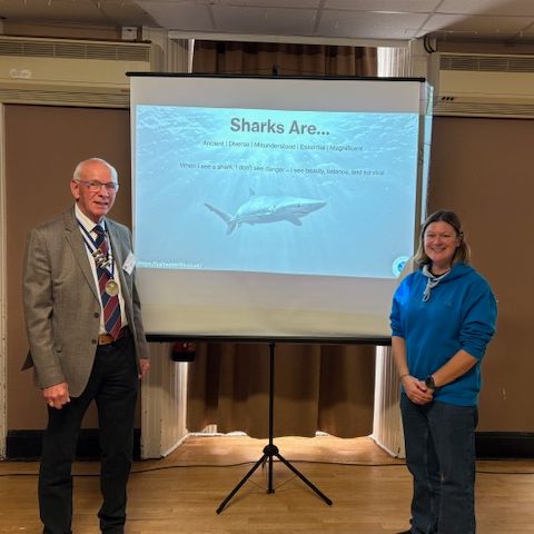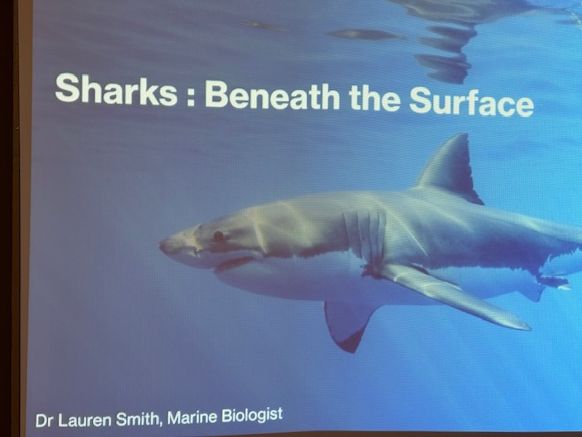 Lauren’s talk centered first on a description of variety’s of shark species, Hammerhead, Great White, Whale Shark, to name but a few. Sharks have been around for over 400 million years and are found in every ocean on the planet. Most species have six senses primarily Electroreception…little pores along nose and body which detect electric impulses from their prey. Whale sharks are the largest species and measure up to 19 meters in length, feeding mainly on plankton. Hammerhead’s have 360 degree vision, and Tiger sharks are deep divers with great vision in low light. Sharks are apex predators and keep other fish populations in check.
